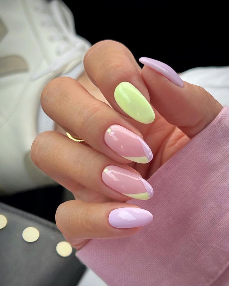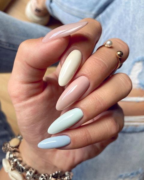 Уявіть собі делікатний баланс між вишуканістю та примхливістю, де м’які пастельні відтінки поєднуються з грайливою привабливістю весни. Перед вами мигдалеві нігті в симфонії весняних кольорів арт-дизайну, кожен ніготь окремого пастельного відтінку. Тонкий шарм рожевого та блакитного створює гармонійне поєднання, а дотик кремово-жовтого додає сонячного світла. Нігті покриті глянцевим топовим покриттям, що надає кожному кольору глянцевого блиску, який нагадує ніжну ранкову росу.