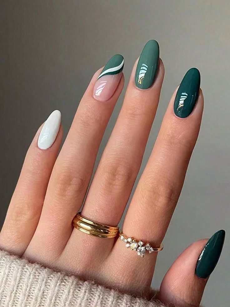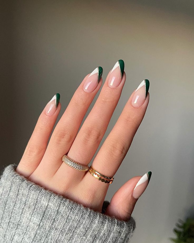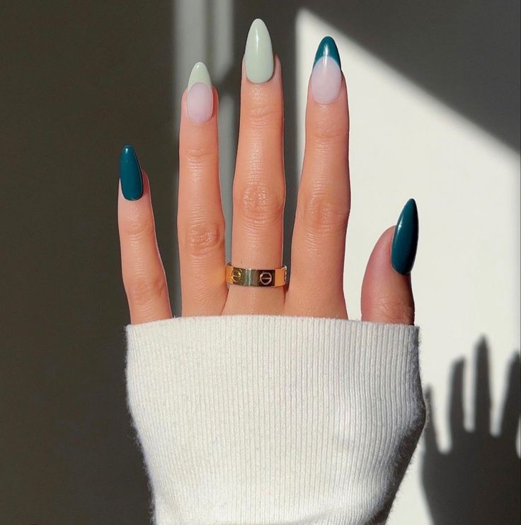 На фото представлені нігті, які є втіленням весняної свіжості. Ці мигдалеві нігті весняних кольорів, що чергуються між чітким білим і освіжаючим м’ятно-зеленим, підкреслені тонкою лінією, де ці два відтінки зустрічаються, символізуючи свіжий новий початок, який приносить весна.
