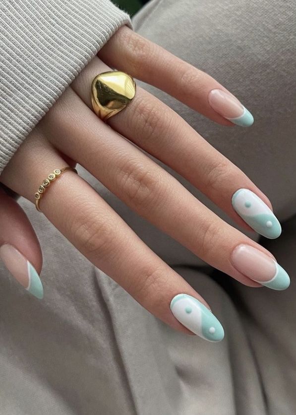 Абстрактне мистецтво не тільки для галерей, воно також ідеально підходить для ваших нігтів! Ці мигдалеві нігті весняно-блакитного кольору демонструють абстрактний дизайн у небесно-блакитному та кремовому кольорах, що нагадує ясний весняний день з клаптиками білих хмаринок. Дизайн простий, але ефект вражає, пропонуючи ковток свіжого повітря до будь-якого ансамблю.