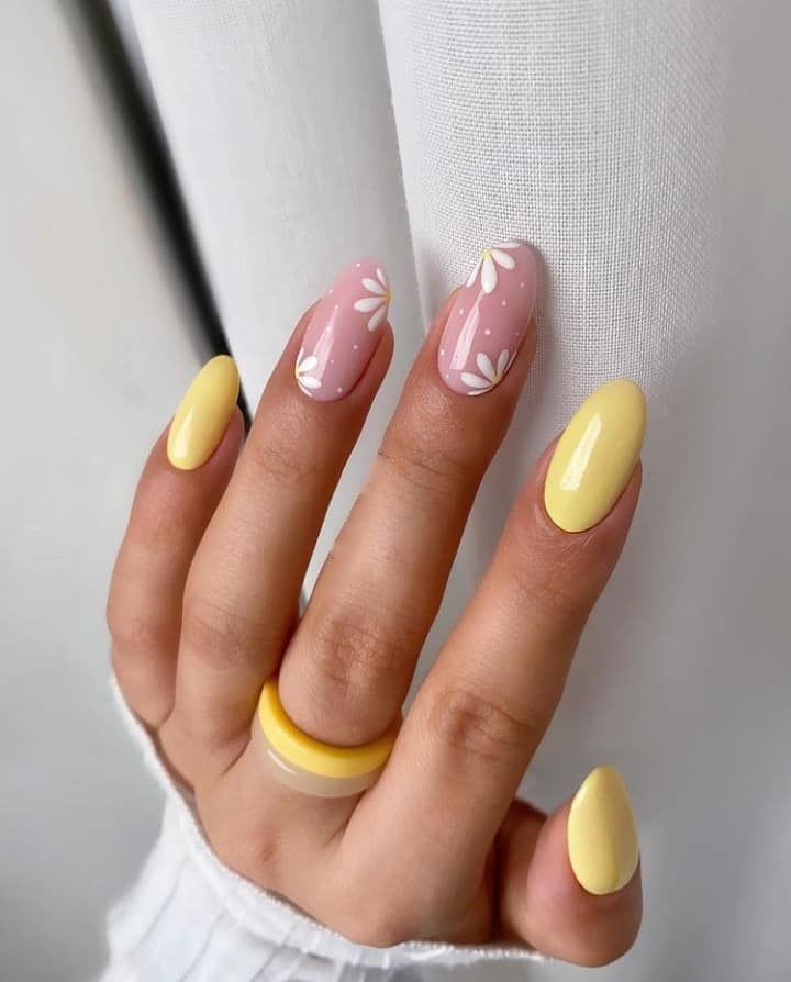 Весна – синонім квітів, і ці мигдалеві нігті передають суть весняного саду в повному розквіті сил. Ніжні рожеві пелюстки ретельно намальовані на приглушено-жовтій основі, створюючи милий та вишуканий дизайн. Ці нігті ідеально підходять для весняного бранчу або прогулянки міським ботанічним садом, пропонуючи тонкий натяк на природну красу, що нас оточує.
