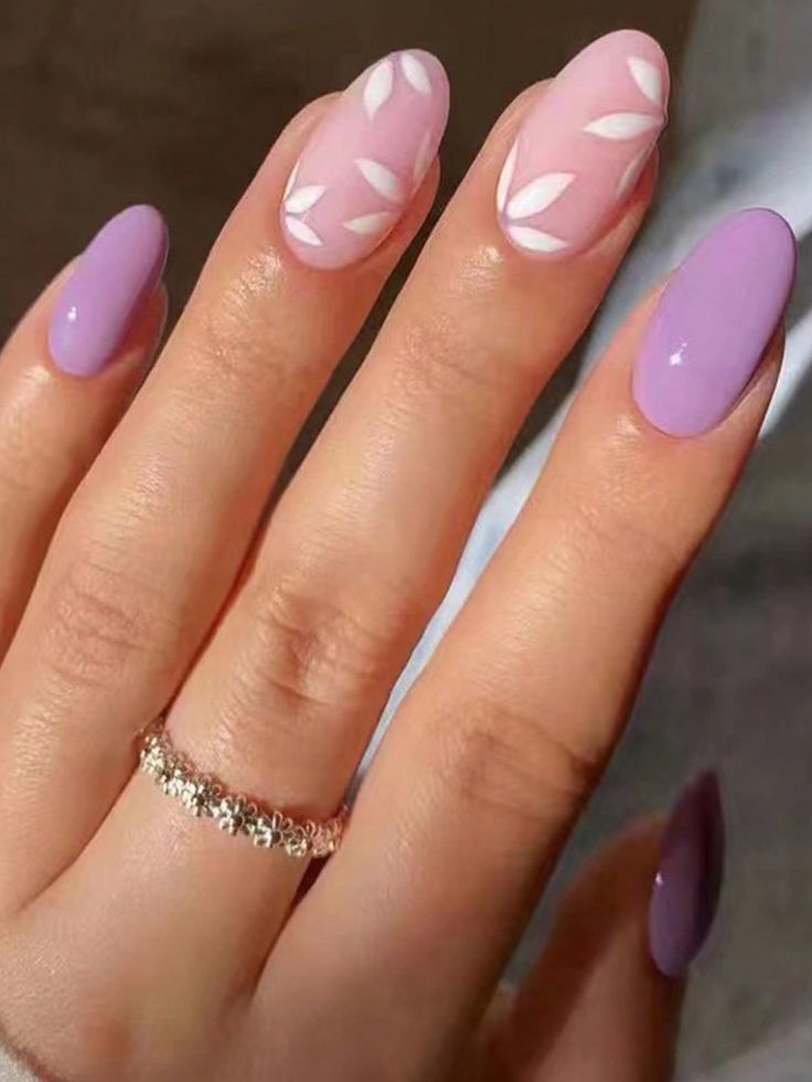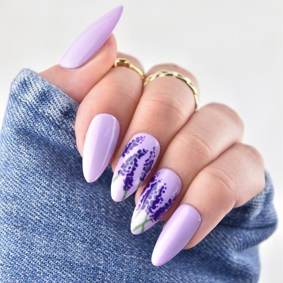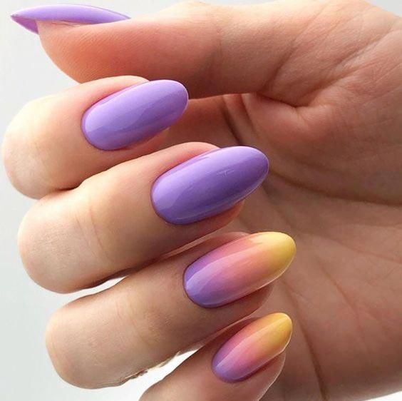 Фотографія нагадує прогулянку лавандовими полями, а нігті вбрані в м’які лавандові та бузкові відтінки, які переходять в теплий, схожий на захід сонця, омбре. Цей весняний дизайн мигдалевих нігтів передає спокійну сутність весни завдяки поєднанню кольорів, що заспокоює душу.