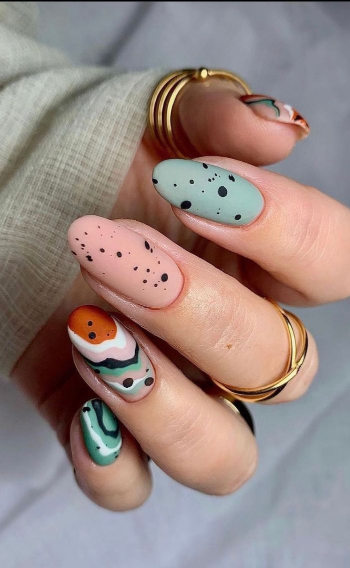 Для тих, хто обожнює богемний шик, цей весняний дизайн мигдалевих нігтів – мрія, що стала реальністю. Земляні тони поєднуються з грайливим горошком, створюючи одночасно приземлений і вигадливий образ. Ці нігті чудово поєднуються з хвилястими тканинами і багатошаровими прикрасами, втілюючи вільний дух сезону.