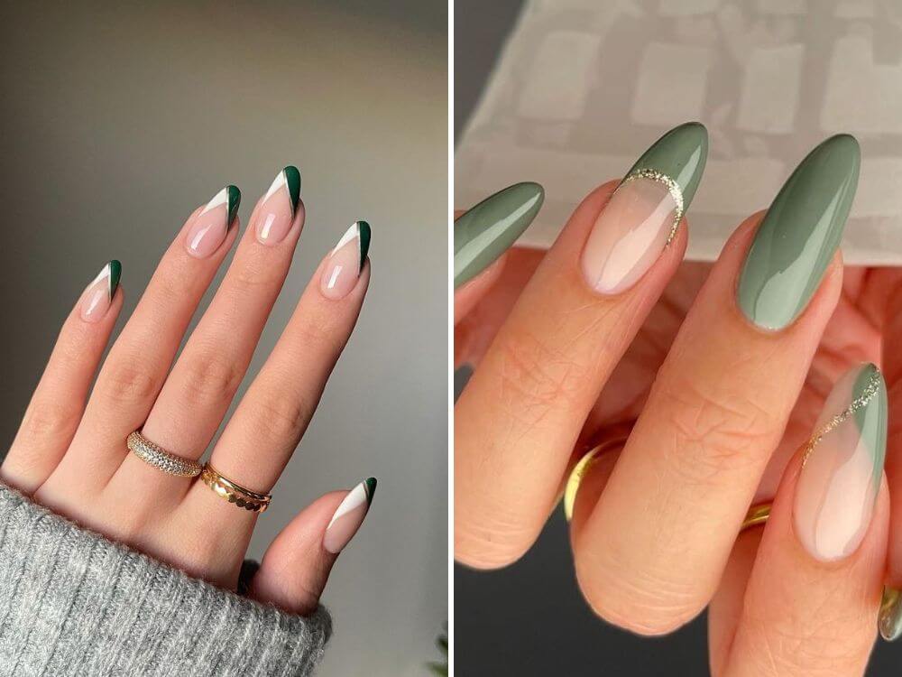 Нігті на фото демонструють ефект омбре, що переходить від пісочно-бежевого до спокійного зеленого кольору морської піни. Цей дизайн передає суть мирної берегової лінії, що зустрічається з океаном, простий дизайн коротких мигдалевих нігтів для тих, хто зберігає спокій пляжу в своєму серці.