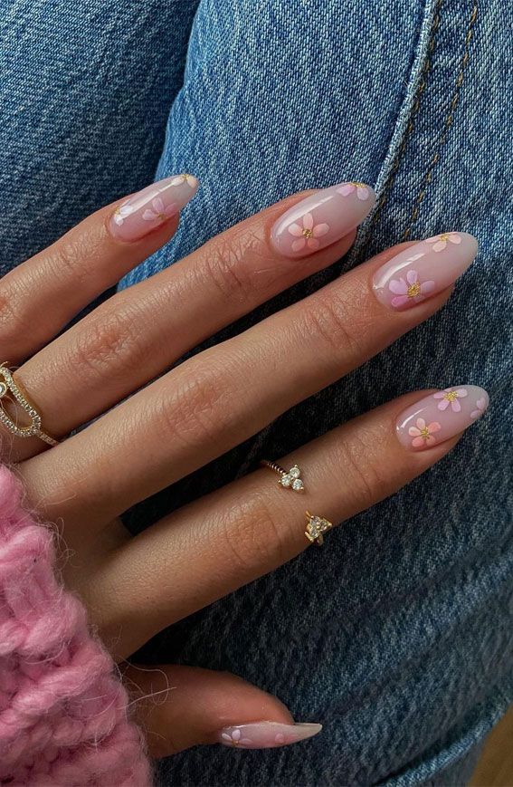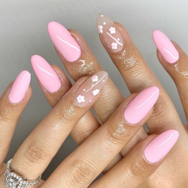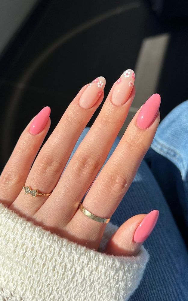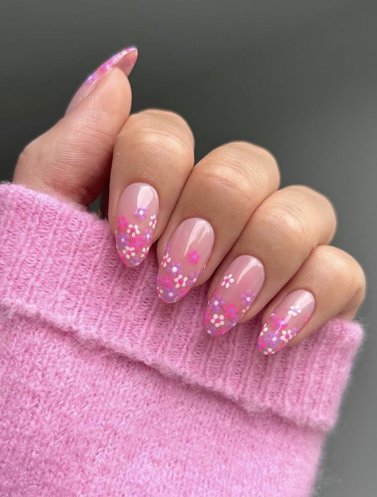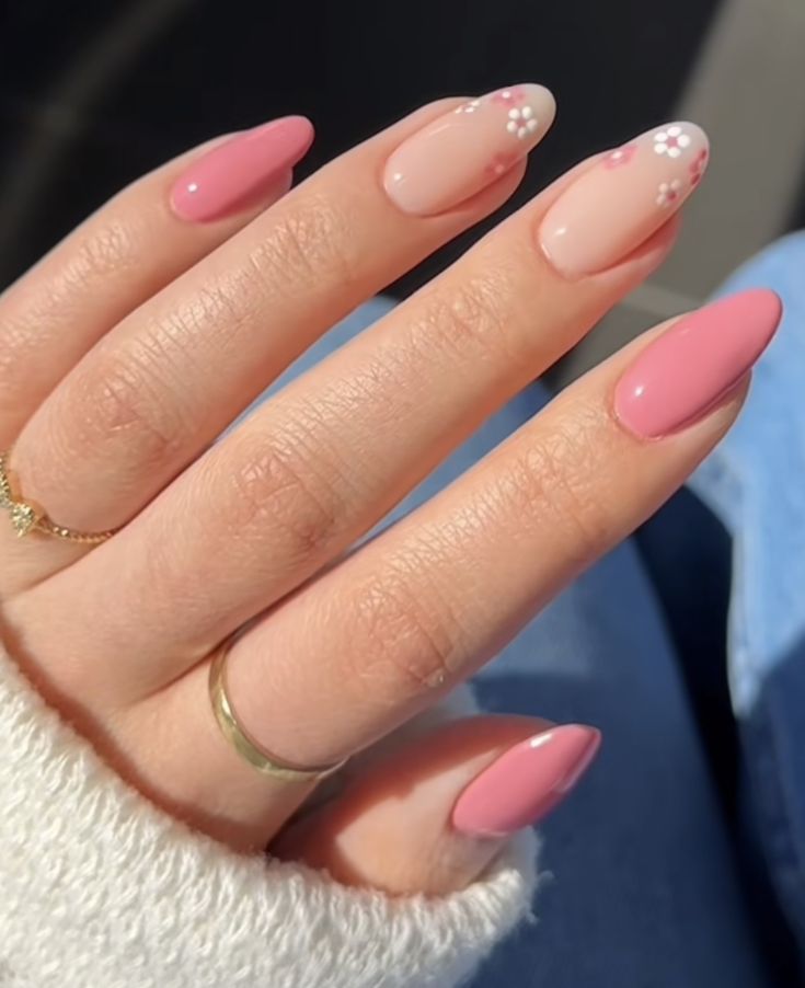Цветочные узоры в розово-белых тонах оживляют весенний розовый нейл-арт, напоминающий цветущий сад. Этот стиль – дань вечной романтике между весной и искусством флористики, созданная для романтиков в душе.