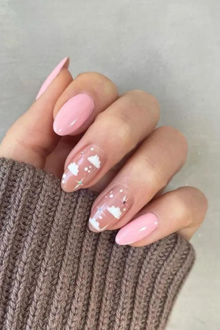 Иногда весна приносит с собой день самоанализа, когда небо затянуто мягкими облаками. Здесь полупрозрачные кончики держат лоскутки белого, олицетворяющие эти задумчивые моменты. Это весенний розовый дизайн для ногтей, который рассказывает историю о спокойных размышлениях среди оживленности сезона.