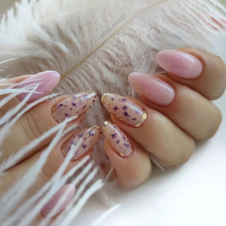 Миндальные ногти, представленные здесь, украшены вкраплениями лаванды, что является отсылкой к душистым полям, которые определяют сезон. Это тонкое сочетание весенних идей маникюра розового цвета с цветными штрихами, вызывающими восхищение и интригу.