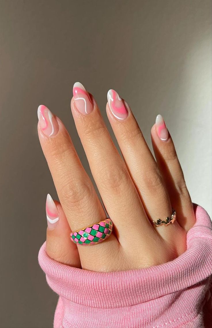 Представьте мягкость первого весеннего румянца на кончиках ваших пальцев. Здесь мы рассмотрим дизайн, в котором розовый цвет переходит в затейливый волнообразный узор, напоминающий весенний розовый нейл-арт – милый и простой одновременно. Этот дизайн достучится до сердца тех, кто обожает минимализм с ноткой игривости.