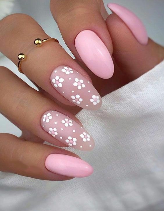 Здесь мы видим праздник цветов и женственности с нежными белыми лепестками, разбросанными на пастельно-розовой основе. Этот дизайн является примером розового весеннего дизайна ногтей, идеально подходящего для весеннего бранча или неспешной прогулки по цветущим городским паркам.