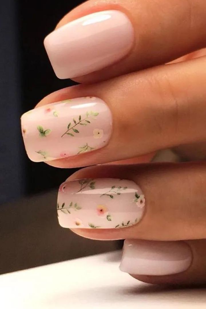 Вневременная красота цветов идеально передана в этом весеннем геле для коротких ногтей. Нежные зеленые листья и крошечные цветы раскинулись на нежно-розовой основе, напоминая о первых весенних дыханиях. Этот дизайн одновременно простой и причудливый, он отсылает нас к сложной красоте цветущей природы.