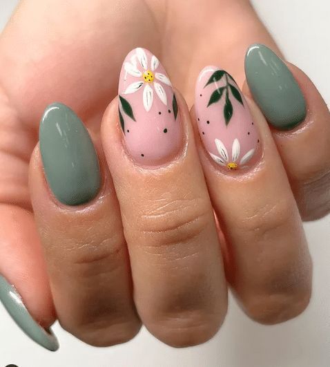 Каждый ноготь на фоне приглушенных розовых и зеленых оттенков рассказывает часть весенней истории для коротких ногтей – от одинокой ромашки до зеленого буйства. Это повествование в нейл-арте, которое дополнит любой весенний ансамбль своим милым и утонченным дизайном.