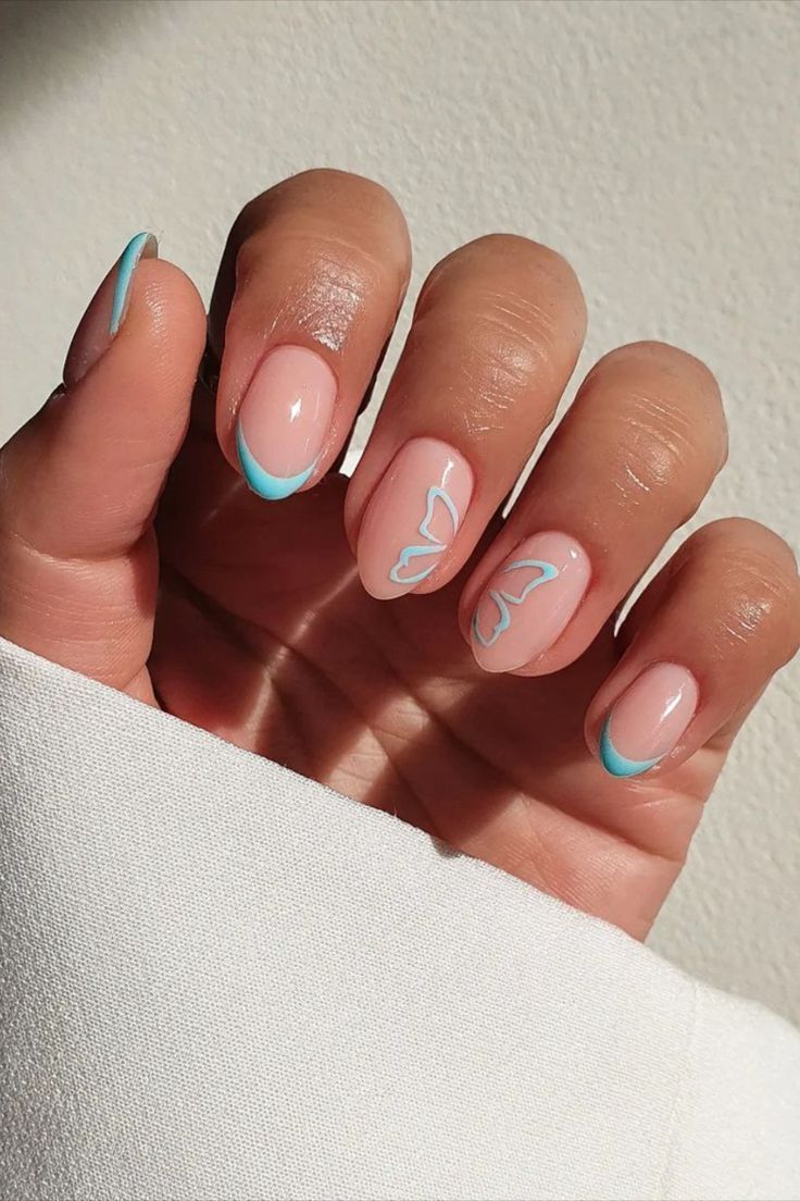 Изящные и очаровательные, эти весенние короткие ногти демонстрируют нежные кончики крыльев бабочки, которые, кажется, трепещут от движения. Нежно-розовый и небесно-голубой цвета создают игривый и простой фон, что является замечательным кивком в сторону весенних созданий.