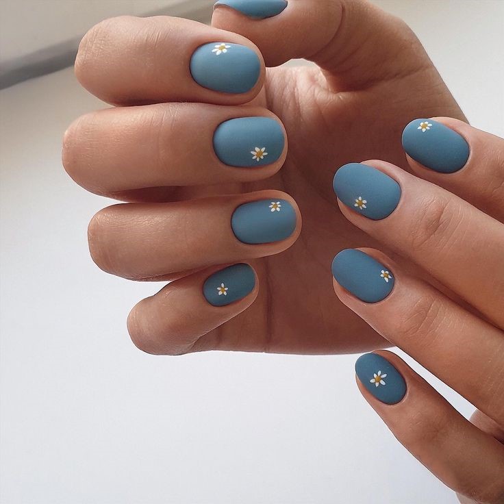 Весенние короткие ногти очаровывают безмятежным небесно-голубым цветом, каждый ноготок украшен очаровательной маргариткой. Матовое покрытие подчеркивает милый аспект дизайна, идеально сочетаясь с идеями весенних коротких ногтей, свежих, как самый свежий весенний воздух.