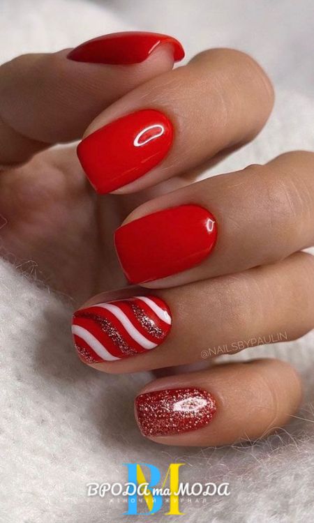 Красный цвет с белыми и блестящими акцентами – это современный подход к новогоднему маникюру. Такой дизайн отлично подойдет к праздничной вечеринке и придаст образу яркости и свежести.