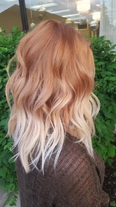 Омбре, що плавно спускається від м’якого мідного до кремового блонду, створює тепле відчуття золотого осіннього сонця. Цей перехід кольорів надає волоссю глибини та руху, а сам відтінок виблискує на сонці неймовірно живими та соковитими барвами.