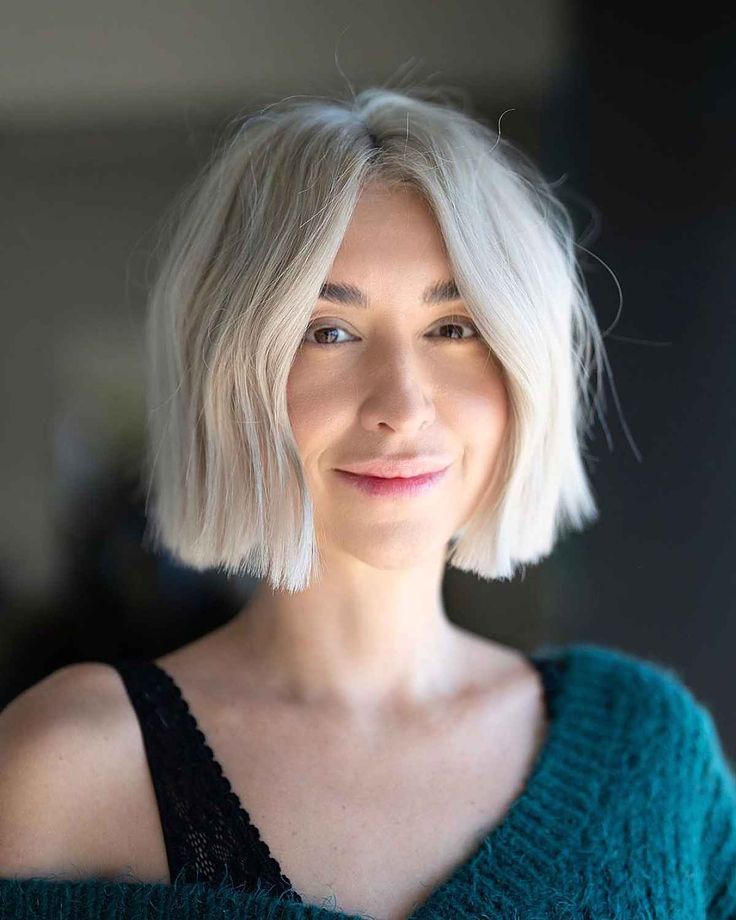 Ця коротка зачіска є свідченням позачасової привабливості каре. Платиновий колір випромінює сміливість, одночасно вражаючу і витончену. Гладкий прямий крій додасть свіжості вашому весняному образу, ідеально втілюючи одночасно милі та свіжі нотки.