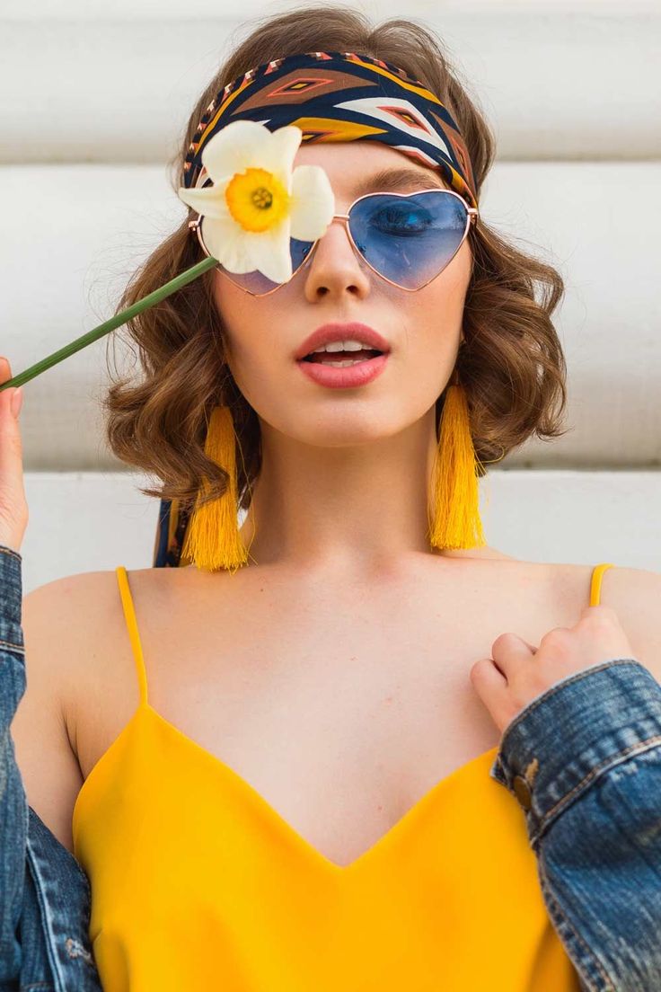 Хто сказав, що стрижки не можуть бути аксесуарами? Цей енергійний жовтий боб у поєднанні з барвистою хусткою випромінює ретро-вібрацію. Це кивок у бік вільного духу 60-х і 70-х років, який показує, як просте доповнення може перетворити образ на виразну заяву.