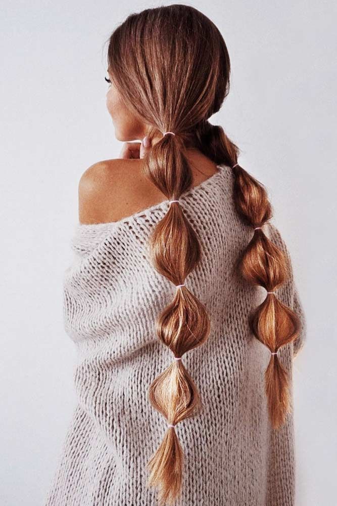 Симпатична літня зачіска на довге волосся отримує грайливий макіяж за допомогою бульбашкового хвоста, вигадливого варіанту класичного поні, який додає нотку вигадливості. У цій зачісці використовуються секції, зав’язані по всій довжині волосся, щоб створити “бульбашки”, створюючи ілюзію об’єму та веселощів для простого стилю.