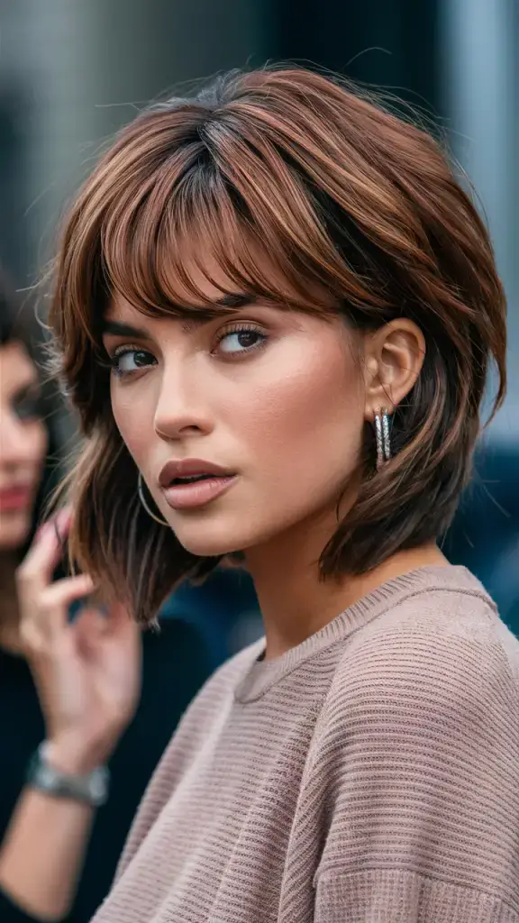 Для тих, хто любить сміливий чубчик, волосся середньої довжини з тупим чубчиком – приголомшливий вибір на 2025 рік. Стрижка середньої довжини опускається трохи нижче плечей, а тупий чубчик додає гострого, сучасного вигляду. Ця зачіска ідеально підходить для жінок з прямим або злегка хвилястим волоссям і особливо добре підходить для овального або серцеподібного обличчя.