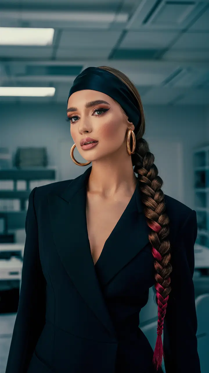 Цей гладкий, довгий хвіст у плетінні підкреслений яскравим відблиском кольору на кінці. Додавання червоних відблисків уздовж коси створює разючий контраст, додаючи вишуканості та модного флеру. Цей образ ідеально підходить для сучасних жінок, які хочуть поєднати елегантність з ноткою індивідуальності.