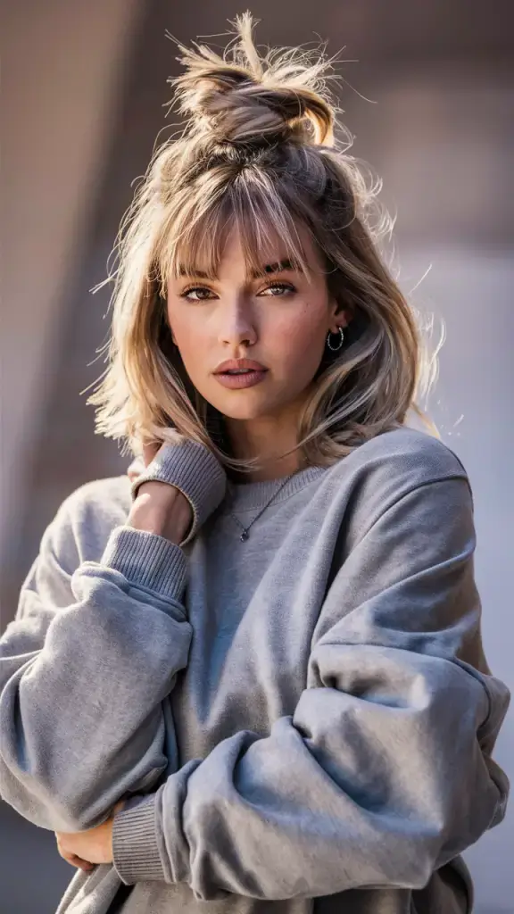 Недбалий верхній вузол з розпущеним чубчиком – це безтурботний, але стильний образ, який ідеально підходить для повсякденних днів або швидкого оновлення зачіски. Верхній вузол навмисно неідеальний, пасма залишаються розпущеними для ефекту розпатланості, а розпушений чубчик пом’якшує загальний вигляд зачіски. Цей стиль ідеально підходить для жінок із середнім або довгим волоссям, які хочуть щось легке, але модне для осіннього або літнього дня.