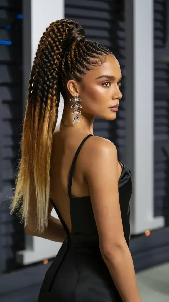 Плетений хвіст з омбре – це сучасний погляд на традиційний хвіст, що відрізняється складним плетінням і яскравим кольором. Волосся зібране у високий хвіст, а коси переплетені між собою, що додає йому текстури. Відблиски омбре додають зачісці глибини та об’єму, що робить її ідеальним модним образом для жінок, які люблять експериментувати з кольором. Ця зачіска ідеально підходить для довгого волосся і добре підходить для таких подій, як випускний вечір або весілля.