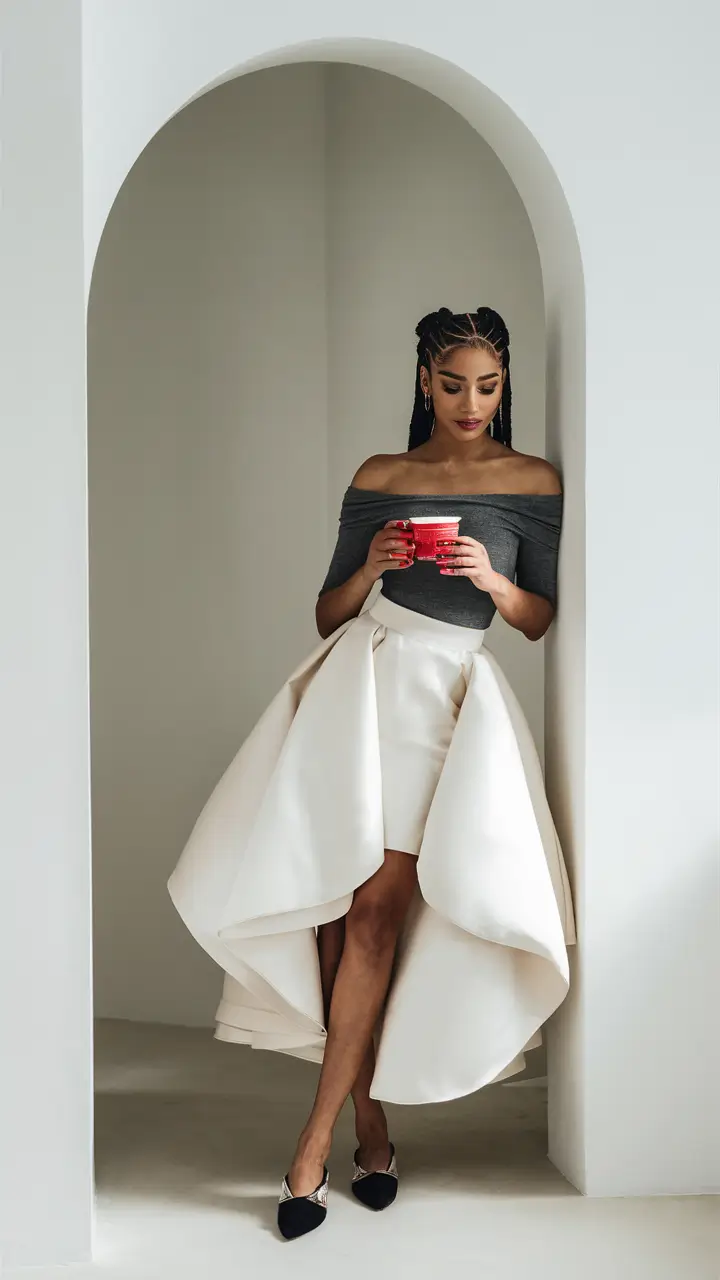 Високий плетений хвіст пропонує шикарний і модний підхід до класичної зачіски. Коса додає елементу вишуканості, а високе розташування хвоста подовжує обличчя, надаючи йому чіткого та витонченого вигляду. Ця зачіска ідеально підходить для тих, хто шукає баланс між елегантністю та сучасним, гострим стилем, і чудово підходить як для офіційних, так і для повсякденних випадків.