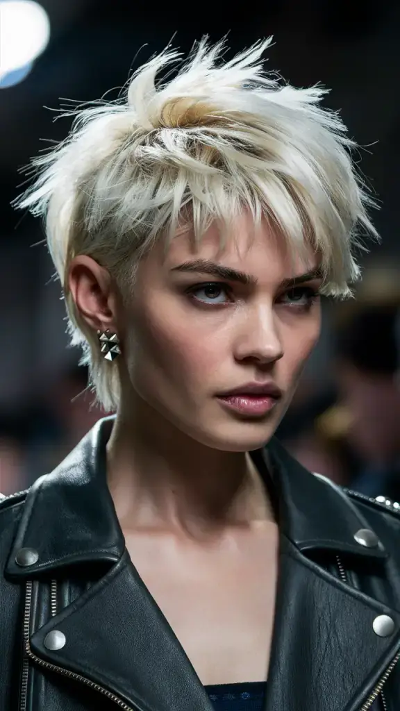 Ця зачіска з гладко зачесаним назад платиновим блондом випромінює впевненість і сміливість. Гладкий стиль зберігає все відполірованим і витонченим, що робить її ідеальною для сучасного, мінімалістичного образу. Ця зачіска ідеально підходить для ділової зустрічі або вечірнього виходу в світ, пропонуючи гладку обробку, яка привертає увагу до рис обличчя.