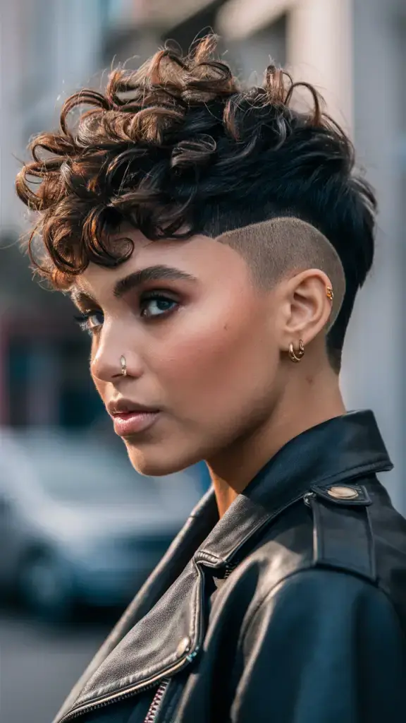 Кучерява стрижка піксі з підрізом – смілива, грайлива і, безперечно, модна у 2025 році. Стрижка піксі має короткі, чітко окреслені локони на маківці з ретельно виголеним нижнім зрізом для контрасту. Ця зачіска найкраще підходить жінкам з кучерявим або кучерявим від природи волоссям, які хочуть продемонструвати його текстуру, зберігаючи при цьому невибагливий стиль. Вона ідеально підходить для подружки нареченої на весіллі або для веселого образу на випускному.